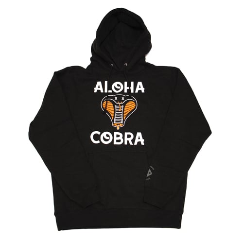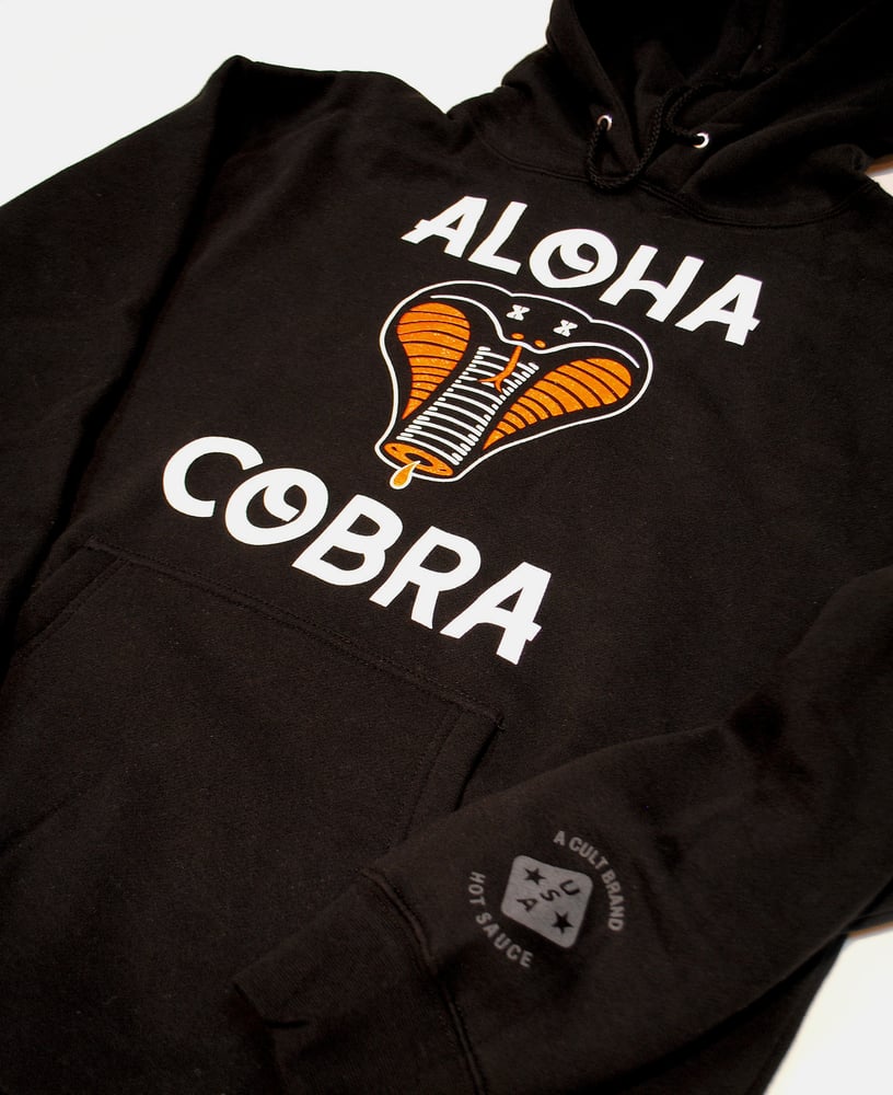 10 ounce heavy-weight big-boy hoody. 100% cotton, from the same jungle Aloha Cobra is made in. Packed up with all the goodies.